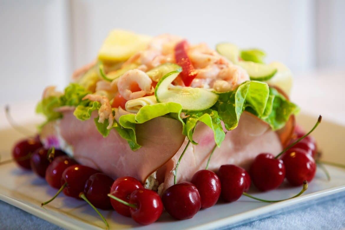 Det här är en klassisk smörgåstårta med majonnäs, lax och räkor. Receptet är för 6 portioner.
