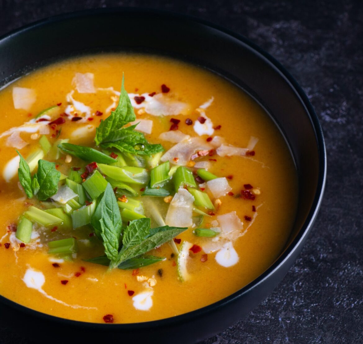 Färska örter som persilja, basilika och koriander förlorar snabbt sin smak om de kokas i en varm soppa. Undvik därför detta. Om du istället strör på dem precis innan servering (när soppan är på tallriken) kommer de ge en härlig fräschör. Även en klick gräddfil eller grekisk yoghurt är alltid ett säkert kort – och är bra om du vill balansera en kryddig soppa eller balansera sötman i exempelvis rotfruktssoppor.